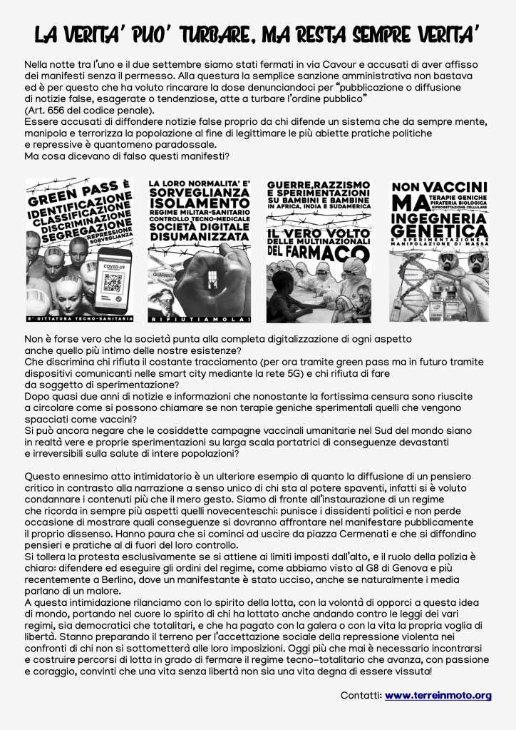 A questa intimidazione rilanciamo con lo spirito della lotta, con la volontà di opporci a questa idea di mondo, portando nel cuore lo spirito di chi ha lottato anche andando contro le leggi dei vari regimi, sia democratici che totalitari, e che ha pagato con la galera o con la vita la propria voglia di libertà. Stanno preparando il terreno per l’accettazione sociale della repressione violenta nei confronti di chi non si sottometterà alle loro imposizioni. Oggi più che mai è necessario incontrarsi e costruire percorsi di lotta in grado di fermare il regime tecno-totalitario che avanza, con passione e coraggio, convinti che una vita senza libertà non sia una vita degna di essere vissuta!