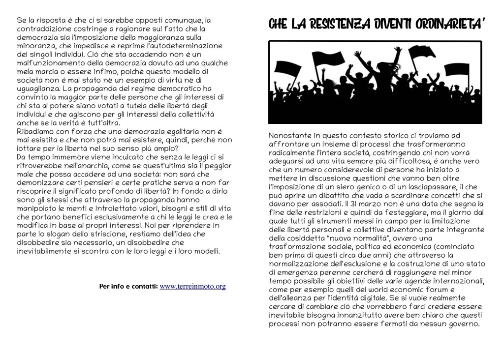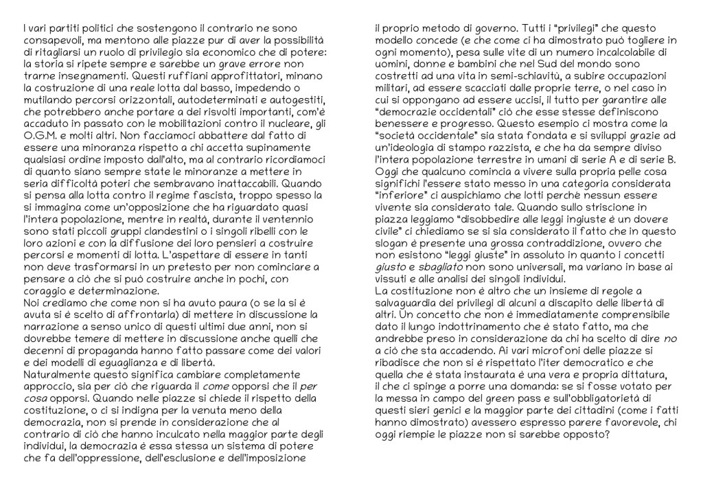 Se la risposta è che ci si sarebbe opposti comunque, la contraddizione costringe a ragionare sul fatto che la democrazia sia l’imposizione della maggioranza sulla minoranza, che impedisce e reprime l’autodeterminazione dei singoli individui. Ciò che sta accadendo non è un malfunzionamento della democrazia dovuto ad una qualche mela marcia o essere infimo, poiché questo modello di società non è mai stato né un esempio di virtù né di uguaglianza. La propaganda del regime democratico ha convinto la maggior parte delle persone che gli interessi di chi sta al potere siano votati a tutela delle libertà degli individui e che agiscono per gli interessi della collettività anche se la verità è tutt’altra. Ribadiamo con forza che una democrazia egalitaria non è mai esistita e che non potrà mai esistere, quindi, perché non lottare per la libertà nel suo senso più ampio?