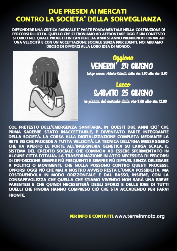 24-25 GIUGNO: PRESIDI AI MERCATI DI LECCO E OGGIONO Posted on 22 giugno 2022 by terreinmoto2021 DUE PRESIDI AI MERCATI CONTRO LA SOCIETà DELLA SORVEGLIANZA