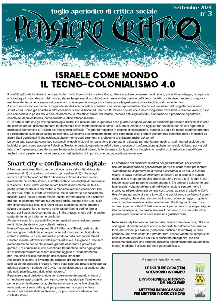 Non c’è niente di meglio del modello democratico israeliano che possa rappresentare ciò che è il fine ultimo del progetto denominato smart world. E’ un dato di fatto che gli sviluppi tecnologici testati in Palestina (ma in generale nelle guerre) vengono venduti all’occidente per essere utilizzati all’interno dei contesti urbani, diventando parte fondamentale della trasformazione in corso. Ciò che comporterà lo possiamo vedere chiaramente in Palestina: analisi dei territori, raccolta dati sugli individui, elaborazione e predizione algoritmica, calcolo dei danni collaterali, confinamento e infine attacco militare. In un contesto come quello italiano non è ancora il momento per chi detiene il potere di utilizzare metodologie radicali come quelle impiegate da Israele. Pertanto, la gestione degli individui in modo sempre più capillare passerà per step intermedi che interverranno direttamente sui corpi, La società del futuro non è quell’immagine da cartolina spacciata dai suoi promotori, ma è più una Gaza allargata: da una parte del muro smart city iper-tecnologiche e dall’altra, l’umanità eccedente, inutile, o forse utile semplicemente per sperimentare sulla loro pelle ogni sorta di tecnologia, per poi essere letteralmente eliminata in caso dia troppi problemi, magari mediante gli stessi sistemi di sterminio automatizzati che in questo momento sta utilizzando, addestrando e perfezionando lo stato israeliano a Gaza.