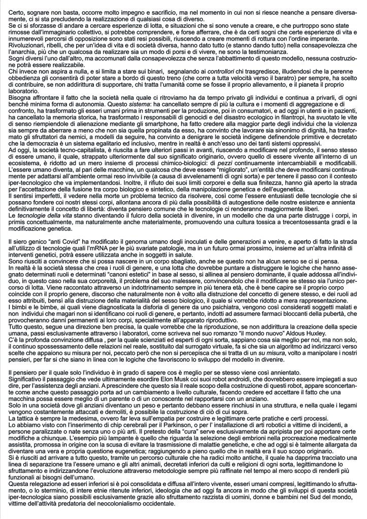 L’importanza dello studio al fine di comprendere e affrontare un sistema complesso come quello nel quale siamo immersi è innegabile. Quello che a volte viene meno è un percorso di tipo introspettivo in grado di elaborare riflessioni profonde su come certi assunti determinano di fatto come agiamo o non agiamo, e persino come ci rapportiamo tra esseri umani e col resto del vivente. Nel momento in cui si vanno a mettere in discussione certi processi e si accusano Stato, lobby, gruppi finanziari e personaggi di ogni sorta, additandoli come artefici dell’abominio nel quale viviamo (o meglio sopravviviamo), è altrettanto importante andare a scavare dentro sé stessi per fare un percorso individuale di liberazione che sia in grado di costruire percorsi di opposizione che abbiano come motore il reale cambiamento radicale del modello di società antropocentrica e oligarchica nella quale viviamo. La diffusione di certi modi di pensare non è mai stata casuale, si dà il caso infatti, che chi aveva idee che potessero mettere in discussione o destabilizzare chi stava in una posizione di comando è stato perseguitato in ogni modo possibile, al contempo si è stato fatto in modo che certi pensieri diventassero endemici all’interno della società. Il confronto su certe convinzioni è necessario in un percorso di lotta condiviso per chiarire con sé stessi e con gli altri cosa non si vuole in questo mondo e al contempo cosa si vorrebbe.