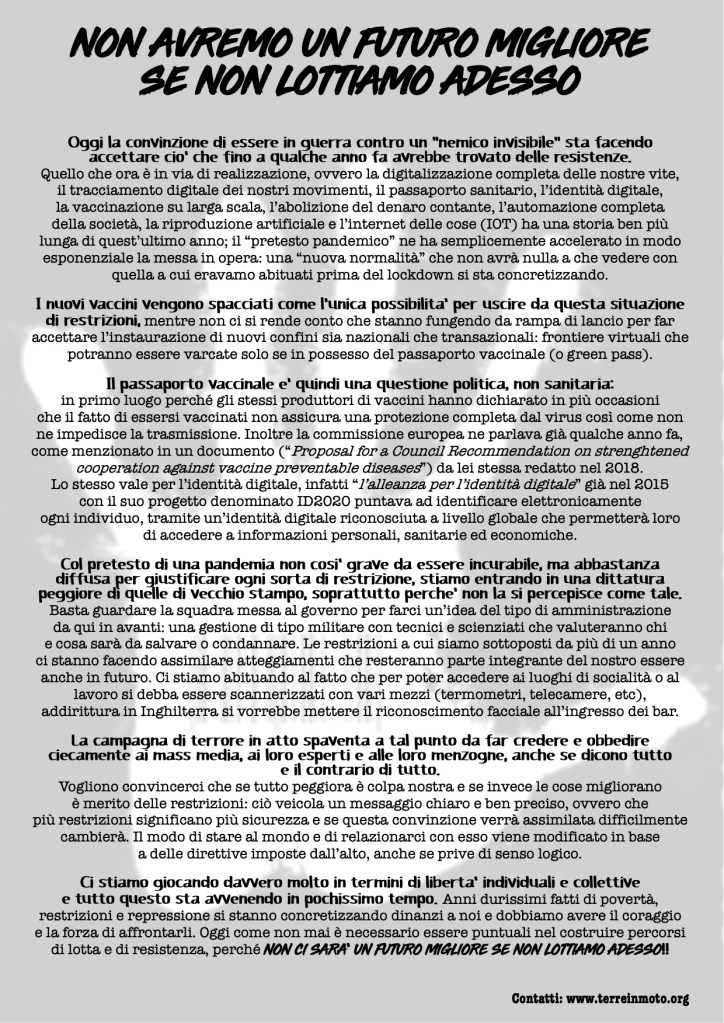 Nonostante in questo contesto storico ci troviamo ad affrontare un insieme di processi che trasformeranno radicalmente l’intera società, costringendo chi non vorrà adeguarsi ad una vita sempre più difficoltosa, è anche vero che un numero considerevole di persone ha iniziato a mettere in discussione questioni che vanno ben oltre l’imposizione di un siero genico o di un lasciapassare, il che può aprire un dibattito che vada a scardinare concetti che si davano per assodati. Il 31 marzo non è una data che segna la fine delle restrizioni e quindi da festeggiare, ma il giorno dal quale tutti gli strumenti messi in campo per la limitazione delle libertà personali e collettive diventano parte integrante della cosiddetta “nuova normalità”, ovvero una trasformazione sociale, politica ed economica (cominciato ben prima di questi circa due anni) che attraverso la normalizzazione dell’esclusione e la costruzione di uno stato di emergenza perenne cercherà di raggiungere nel minor tempo possibile gli obiettivi delle varie agende internazionali, come per esempio quelli del world economic forum e dell’alleanza per l’identità digitale.