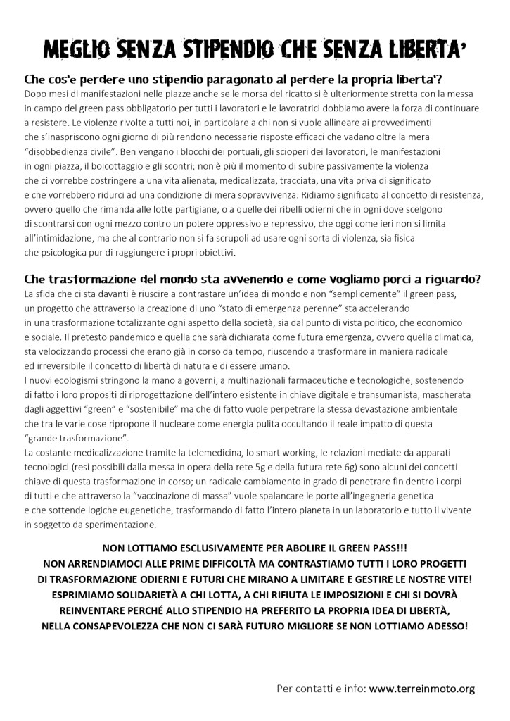 MEGLIO SENZA STIPENDIO CHE SENZA LIBERTA’ – Volantino distribuito alla manifestazione del 16/10/21 a Lecco